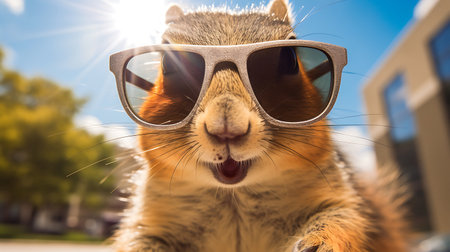 Close-up selfie portrait of a hilarious squirrel wearing sunglasses.