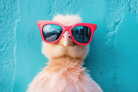 A chick sports oversized sunglasses while standing in front of a bright blue wall showcasing a playful and humorous vibe in a vibrant setting.