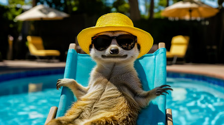 A meerkat wearing sunglasses and a yellow hat sitting in a chair next to a pool.