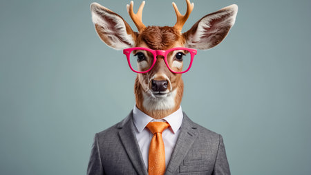 Antelope with sunglasses and hat, orange background, safari travel ads, text space.