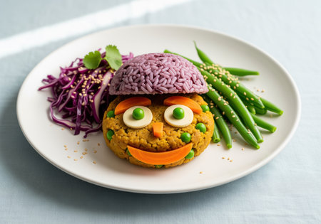 A charming and creative vegetarian meal featuring a chickpea patty arranged as a smiling face, complete with purple rice hair, carrot features, and sides of green beans and red cabbage. perfect for encouraging healthy eating in children.