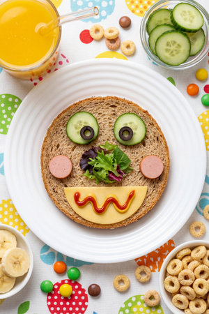 Homemade round sandwich arranged from bread, cheese, vegetables, sausage as a smiling face on a plate. Creative food presentation for children, everyday meal idea, playful mood and simple home cooking