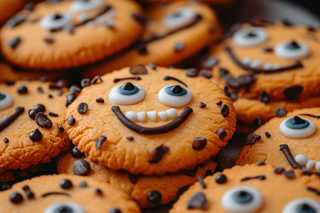 Close-up of homemade halloween cookies decorated with candy eyes and chocolate chips