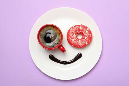 Smile face made of plate with donut, chocolate sauce and coffee on violet background