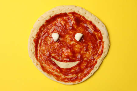 Pizza dough with sauce and smile on yellow background