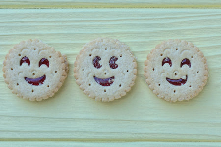 Funny cookies with funny faces on wooden table and blurred background.