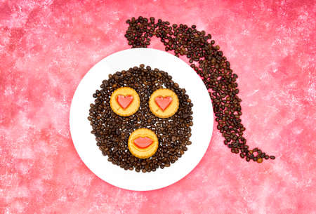 Woman's face made of roasted coffee beans and decorated cookies on a pink background
