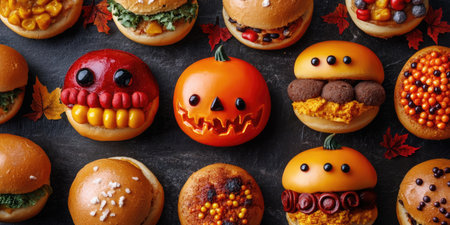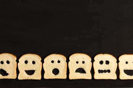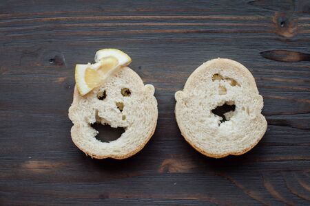 A close-up view of a sandwich with fun and playful faces on it. This image can be used to add a touch of creativity and humor to food-related projects or to depict a whimsical mealtime scene.