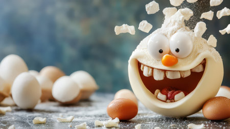 A whimsical egg character bursts with joy among scattered eggs and flour showcasing a playful approach to cooking in a kitchen setting.