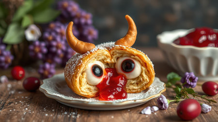 Creative dessert on a plate with eyes and horns made from pastry, served alongside fruit jam and garnished with flowers
