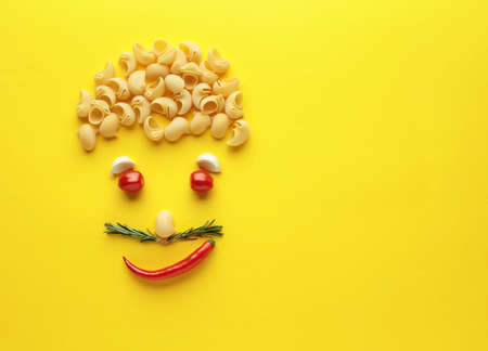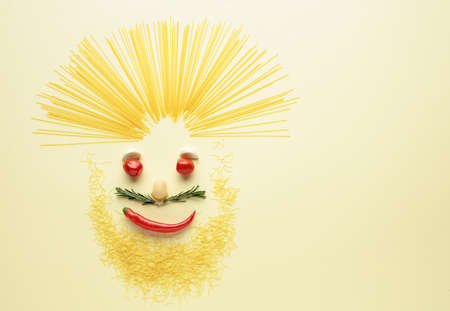 Funny portrait of a chef. Using ingredients for making pasta. Copy space.