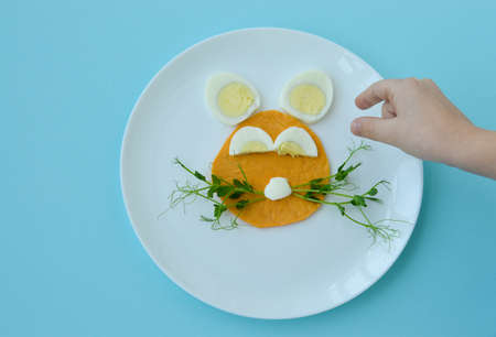 Plate with funny children's breakfast in the shape of human face on gray table