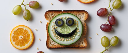 AI Generated. Creative snack arrangement with happy face made of cucumber on toasted bread surrounded by fruits