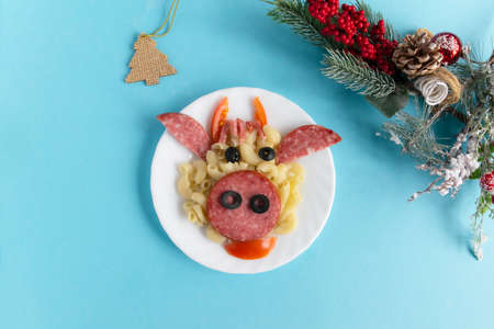 Funny Breakfast for children in the form of bulls face made of pasta, sausage, bacon, olives and fresh tomatoes on a blue background. Plate with creative food art Breakfast for children