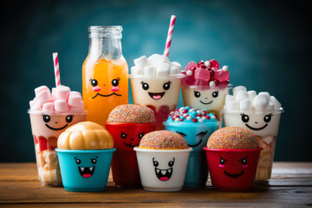 funny colorful Halloween food over a wood background. ai generated