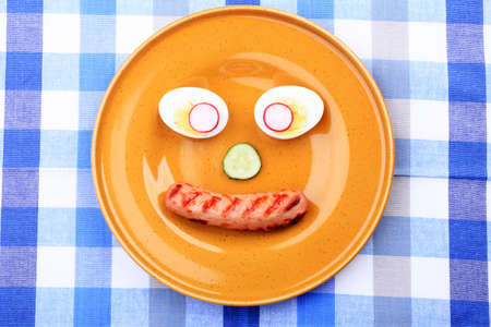 Shot of a dish with funny face made of fried sausage, egg and greens.