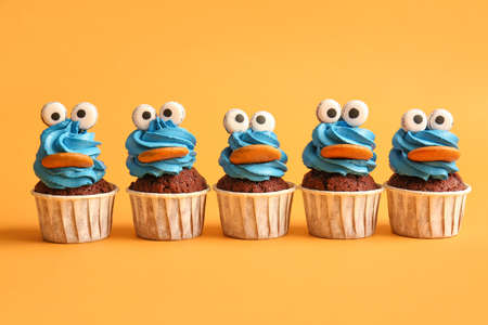 Tasty funny cupcakes for Halloween celebration on color background