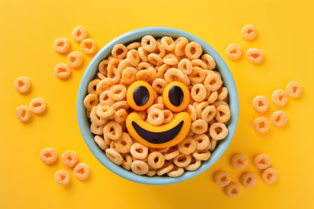 Children's healthy breakfast cereals arranged in a smiley face shape on a yellow background top view
