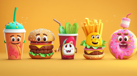 Whimsical plea: cartoon characters, fast food holding a sign 'Stop Eating Us.' A playful take on the concept of proper nutrition and the pursuit of a healthier lifestyle