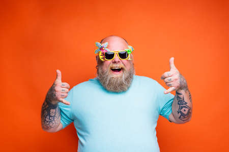 Fat happy man with beard, tattoos and sunglasses is ready for the summer