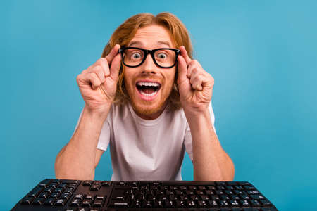 Portrait of impressed frustrated man touching his specs stare screaming isolated over white background
