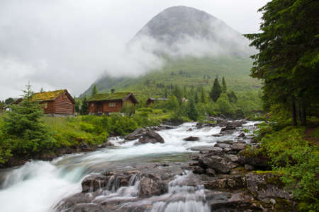 hut wooden mountain huts in mountain pass Norway. Norwegian landscape with typical scandinavian grass roof houses. Mountain village with small houses and wooden cabins with grass on roof in valley.
