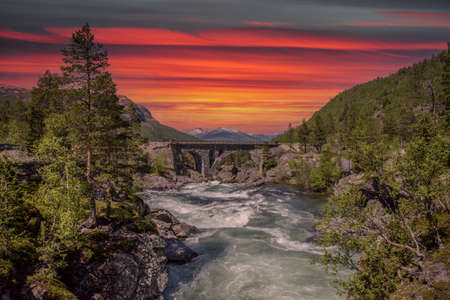beautiful landscape at sunset mountains forests rivers and glaciers Norway