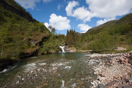 Tundra biome landscape in Norway. Mountain stream in Aurlandsfjellet.