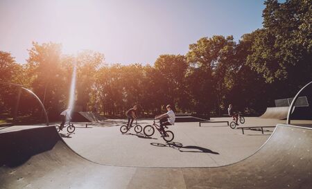 Young riders on BMX bicycles on the ramp of the skate park in the city public park for active recreation