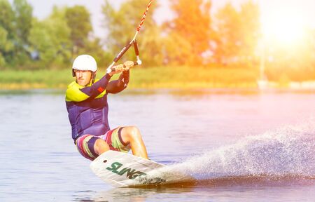 Active wakesurfer jumping on a wake board down the river waves against the blue sky