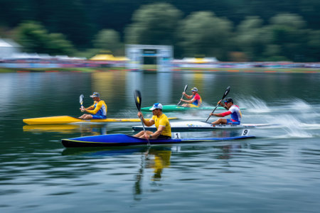 Professional kayakers paddling during a race on a lake, showcasing teamwork, athleticism, and the thrill of competition