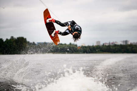 athletic woman doing flips and jumping over the water on wakeboarding board