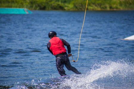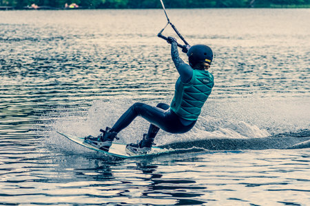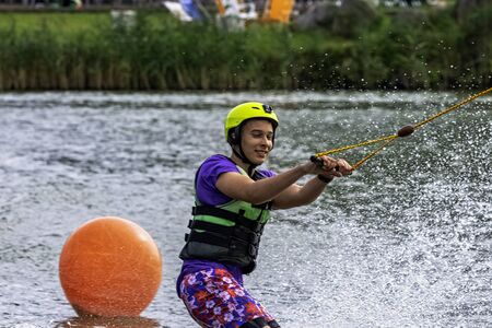 Vilnius, Lithuania - June 8 2021: Girl with helmet and life vest rides a wakeboard on the lake with forest on background, wakeboarding, water sport in summer