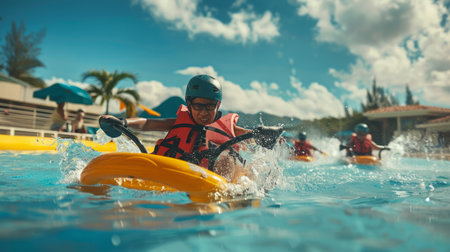 Group of people riding on top of kayaks on body of water. Generative AI.