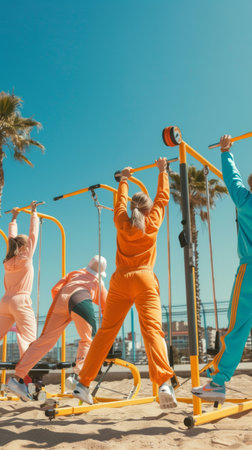 A group of friends dressed in colorful workout gear engages in a fitness routine outdoors at the beach. The sun shines brightly as they use exercise equipment, enjoying the moment together.