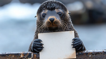 A curious seal stands on a weathered surface, holding a blank sign with its flipper. The surrounding ocean is calm, creating a serene atmosphere during daylight.