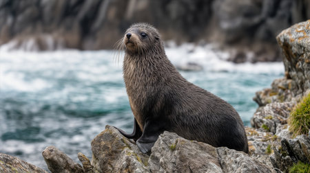 A South American fur seal Arctocephalus australis resting on a rocky coastline by the ocean, surrounded by waves and rugged cliffs, showcasing its dense fur and natural marine habitat.