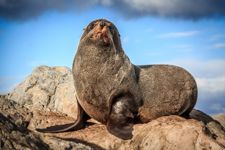 Fur seal chilling at the Pacific Ocean on the South Island of New Zealand