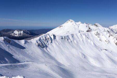 Beautiful landscape of Caucasus Mountains on ski resort Krasnaya Polyana on background clear sky