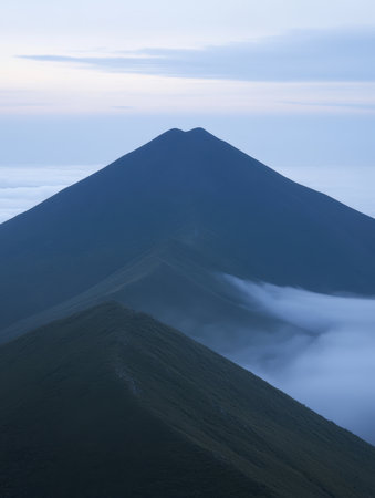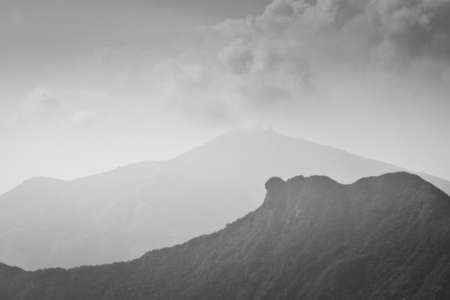 Mt. Kotaro and Mt. Asayo peaks in morning clouds.