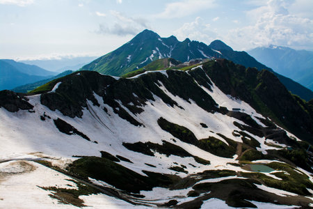 TATEYAMA, JAPAN - June 11, 2017: Japan Alps with melting snow. The Tateyama Kurobe Alpine route operate in late April until November, is one of the tourist attraction in Japan.