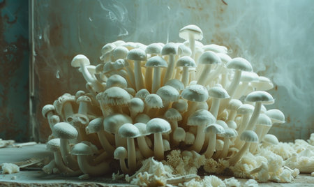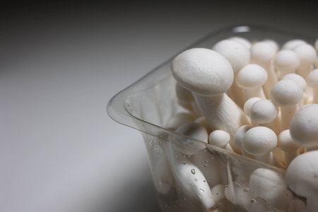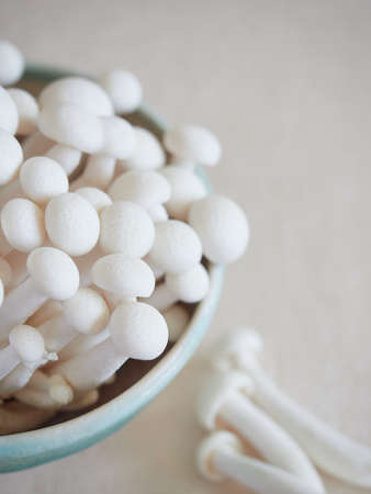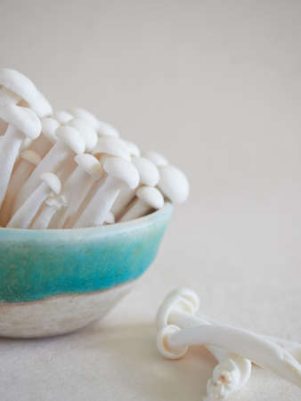 white edible mushrooms shimeji on ceramic background