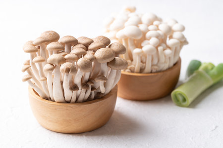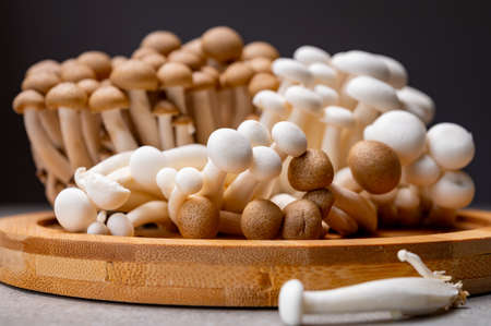 Fresh uncooked buna brown and bunapi white shimeji edible mushrooms from Asia, rich in umami tasting compounds such as guanylic and glutamic acid