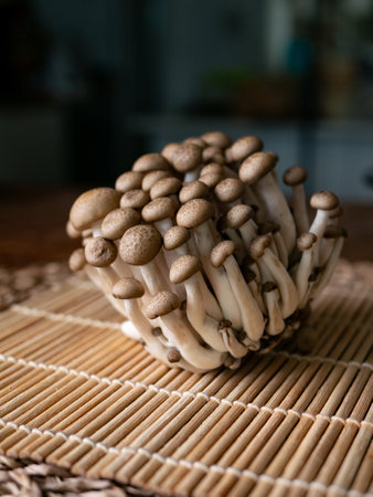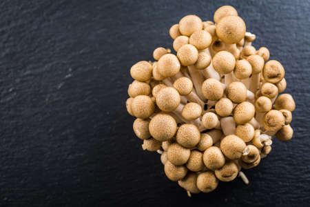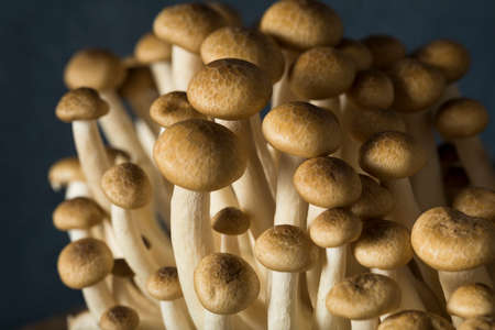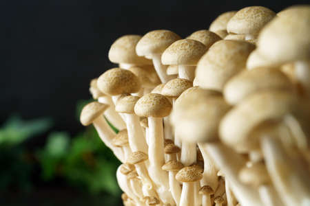 Fresh uncooked buna brown shimeji edible mushrooms from Asia, rich in umami tasting compounds such as guanylic and glutamic acid
