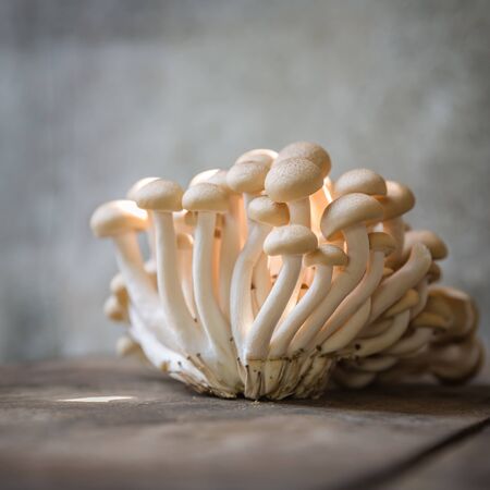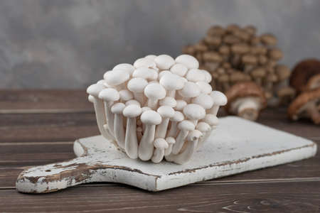 White beech mushroom on white desk and wood table. Close-up.
