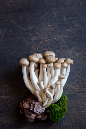 Uncooked Shimeji mushrooms on rustic surface