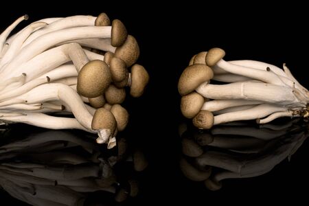 Lot of whole arranged shimeji brown mushroom isolated on black glass