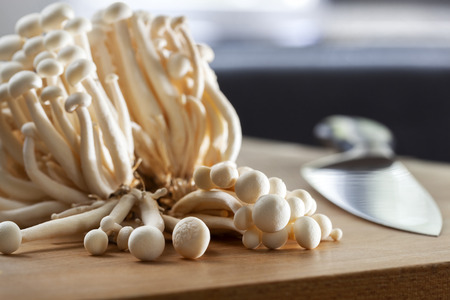 Edible shimei mushrooms and a knife on a chopping board in the kitchen