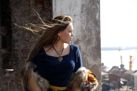 young woman in medieval dress and fox fur