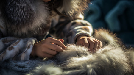 The close-up captures the rich textures of a beautifully crafted textile featuring detailed patterns alongside soft, luxurious fur, illustrating careful artistry and design.